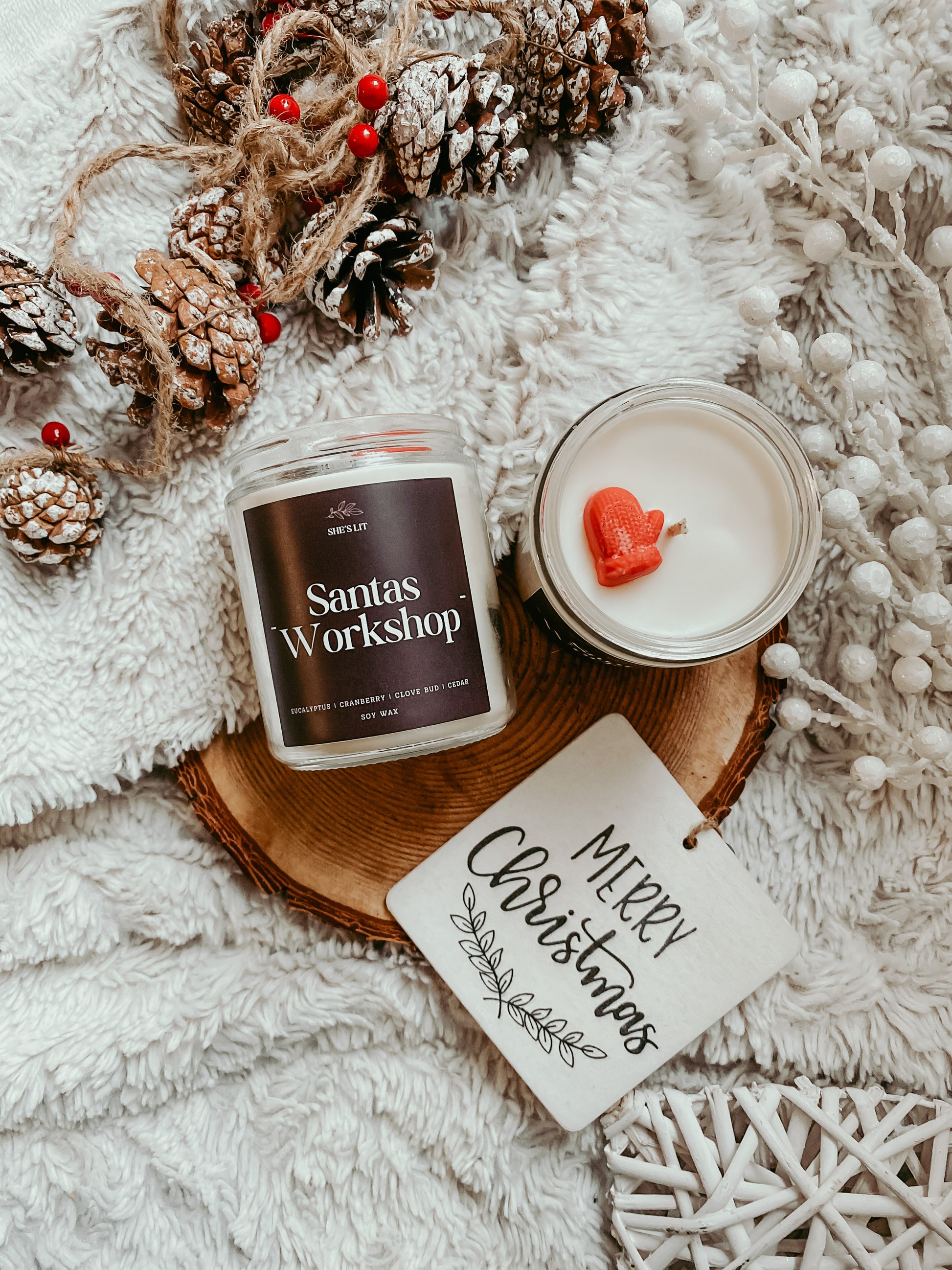 Santa’s Workshop- It’s a jar of holiday memory. Tart cranberry and sunburst orange mingle with juicy raspberry, while cinnamon and clove add the comforting, familiar spice of grandmas kitchen. The scent settles into a soft, woodsy finish. Like toys stacked beside a crackling hearth. Its the smell of laughter, wrapping paper, and everything that makes the season feel like home.